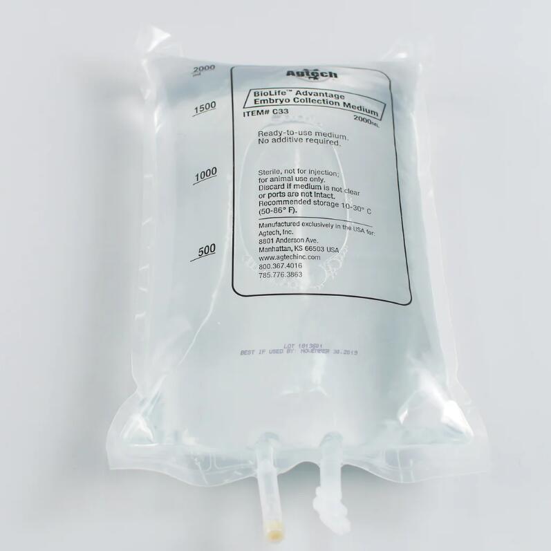 完整冲胚液,产品直接使用。采用聚乙烯醇(PVOH)替代血清和牛血清白蛋白必需的表面活性剂,由此,无需担心血清可追溯性和血清供体的健康问题。采用美国最先进的乙烯-醋酸乙烯共聚物(EVA)袋封装,规格为2000毫升,无菌注入。EVA袋的技术优势在于可维持胚胎收集培养基的临界pH值和关键性渗透压。具有萃取物零浸出,pH值零漂移,以及细胞的高生长特性。Agtech的EVA袋密封、不漏气,经无毒认证。袋子接缝采用射频熔接,接缝强度好,完全满足洲际运输和现场使用的要求。