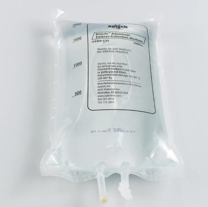 完整冲胚液,产品直接使用。采用聚乙烯醇(PVOH)替代血清和牛血清白蛋白必需的表面活性剂,由此,无需担心血清可追溯性和血清供体的健康问题。采用美国最先进的乙烯-醋酸乙烯共聚物(EVA)袋封装,规格为2000毫升,无菌注入。EVA袋的技术优势在于可维持胚胎收集培养基的临界pH值和关键性渗透压。具有萃取物零浸出,pH值零漂移,以及细胞的高生长特性。Agtech的EVA袋密封、不漏气,经无毒认证。袋子接缝采用射频熔接,接缝强度好,完全满足洲际运输和现场使用的要求。
