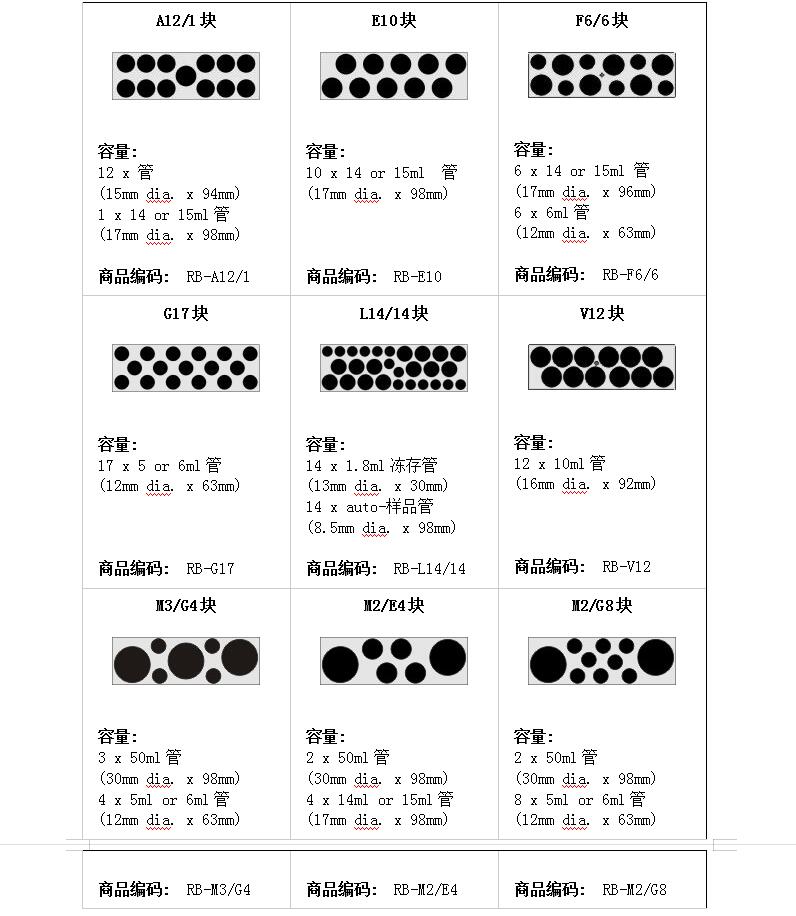 适应大多数应用的各种尺寸的样品管,可以容纳在导热块中。所有块由优质,无孔阳极氧化铝制成。这些块可由用户自行拆下清洗、烘干、热杀菌或互换。块的范围可以容纳各种形状和从1.8ml到50.0ml大小的管。